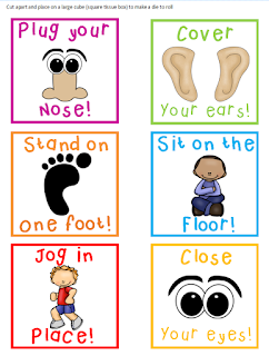 For Sr. the dots will also have a number on them from 1-6. A child will roll the color die and the number die. Say he rolls blue and 5. Everyone will a blue sticker or a 5 will stand and sing.